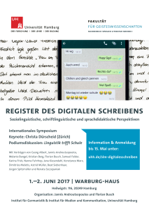 Das Symposium beschäftigt sich im Dialog von Soziolinguistik, Schriftlinguistik und Sprachdidaktik mit der Frage, wie die Varianz von Schreibformen in der digitalen Kommunikation mit sozialen und situativen Kontexten korrespondiert. 14 Vorträge und eine Podiumsdiskussion thematisieren solche Korrespondenzen aus drei Perspektiven: