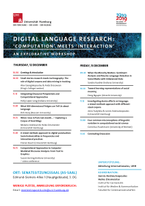 Occasioned by a long-standing university partnership between Indiana University and Universität Hamburg, this workshop brings together linguistics researchers from both universities and selected guests from other institutions. The aim of the workshop is to explore questions, methods and opportunities of ‘digital language research’ at the intersection of approaches from computational linguistics and sociolinguistics / computer-mediated discourse analysis. Despite the emergence of new research fields, such as computational sociolinguistics (Nguyen et al. 2016, Eisenstein 2015), exchange between ‘computational’ and ‘interactional’ approaches has been rather limited, but seems urgently needed. The workshop brings together a small number of senior and junior faculty to promote interdisciplinary discussion and exchange across said areas in informal atmosphere. Participants will present a piece of their own (recent) research and explore its methodological and epistemological implications in view of questions such as the following: (a) How do understandings of ‘data’ and ‘context’ differ across and within between ‘computational’ and ‘interactional’ approaches to digital language research? (b) What does it take to achieve cross-disciplinary learning and synergy and to develop mixed-methods research that pulls interaction and computational analysis together? (c) Is it possible to identify research themes that would gain added value from such synergy, for example research on hate speech or political discourse online?